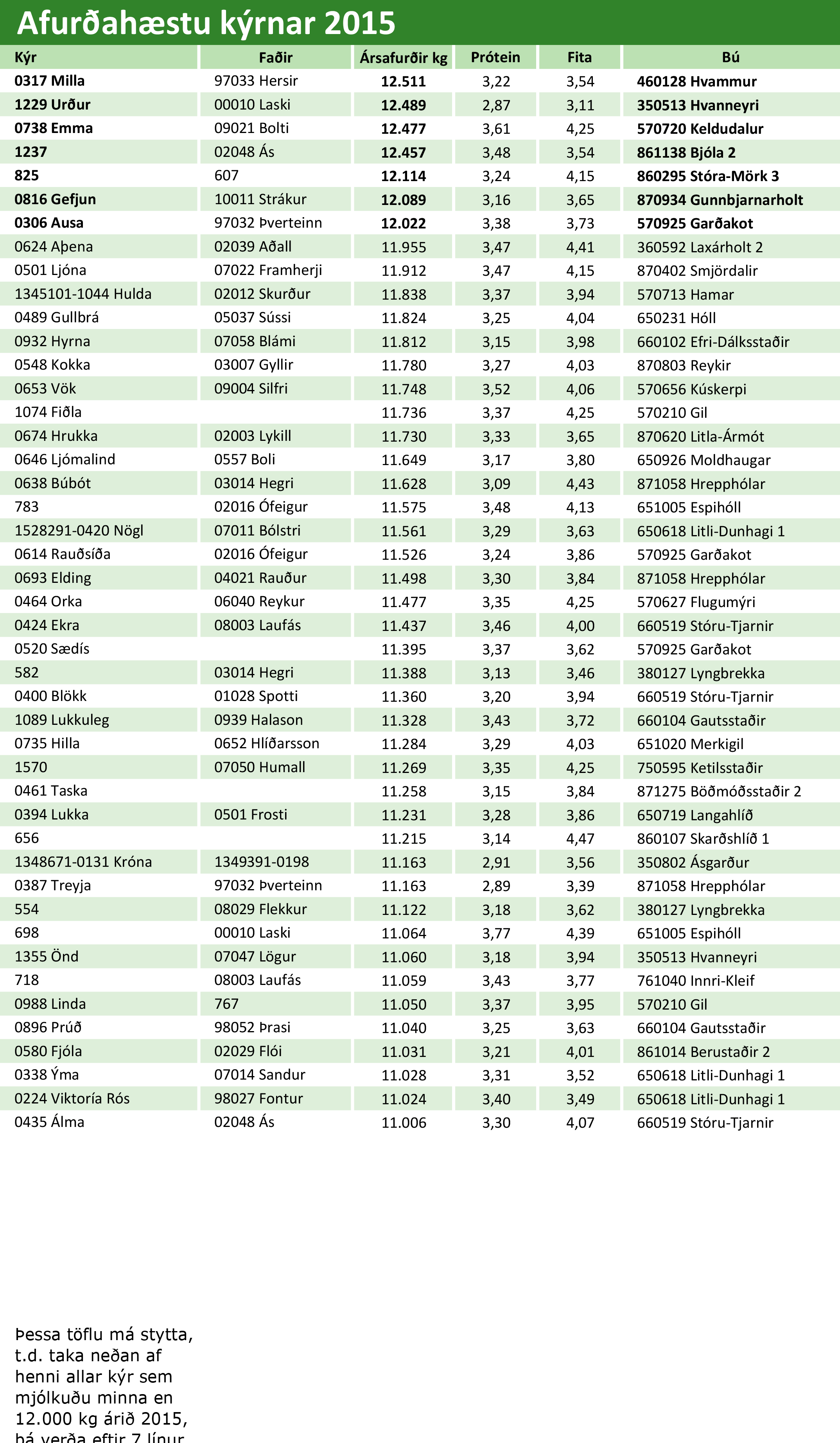 Nythæsta kýrin á skýrsluhaldsbúunum árið 2015 var Milla 317 í Hvammi á Barðaströnd, undan Hersi 97033, en hún mjólkaði 12.511 kg með 3,54% fitu og 3,22% prótein. Burðartími Millu féll að þessu sinni ágælega að almanaksárinu en hún bar sínum sjötta kálfi 11. nóvember 2014. Milla er mikil mjólkurkýr, fór hæst í 47,3 kg dagsnyt á liðnu ári og skráðar æviafurðir hennar voru 54.976 kg um síðustu áramót en sinn fyrsta kálf átti hún 27. janúar 2008, þá 29 mán. að aldri. Önnur í röðinni árið 2015 var Urður 1229 á Hvanneyri í Andakíl, undan Laska 00010, en hún mjólkaði 12.489 kg með 3,11% fitu og 2,87% prótein. Þriðja nythæsta kýrin var Emma 738 í Keldudal í Hegranesi, undan Bolta 09021, en nyt hennar á árinu var 12.477 kg með 4,25% fitu og 3,61% prótein. Fjórða nythæsta kýrin var kýr nr. 1237 í Bjólu í Rangárþingi ytra, dóttir Áss 02048, en hún mjólkaði 12.457 kg með 3,54% fitu og 3,48% prótein. Fimmta í röðinni var kýr nr. 825 í Stóru-Mörk undir Eyjafjöllum, dóttir 607 (undan Laska 00010), en hún skilaði 12.114 kg á árinu með 4,15% fitu og 3,24% prótein. Alls skiluðu 45 kýr afurðum yfir 11.000 kg og þar af sjö yfir 12.000 kg. Árið 2014 náðu 22 kýr nyt yfir 11.000 kg.