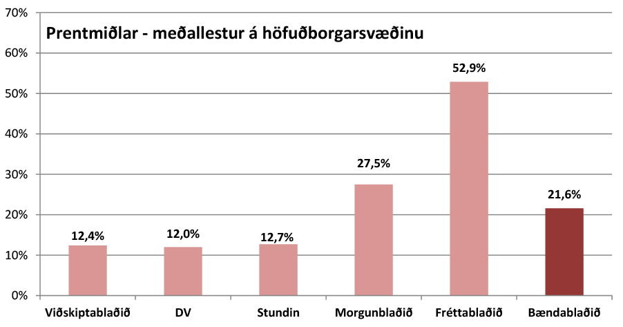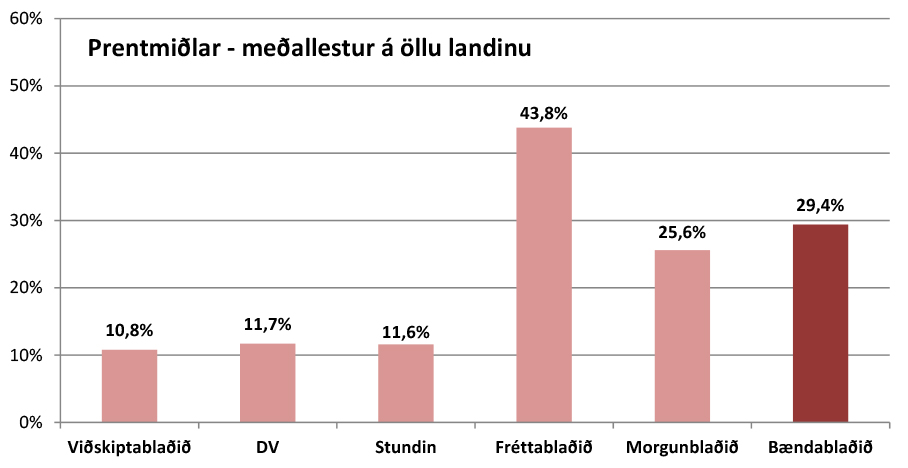 Heimild: Prentmiðlakönnun Gallup. Könnunartími okt.-des. 2017. Í könnuninni er lestur dagblaða mældur með samfelldum hætti allt árið. Um 30 svörum er safnað á hverjum degi eða um 2500 svörum á ársfjórðungi. Í úrtakinu eru Íslendingar á aldrinum 12-80 ára af landinu öllu.