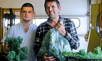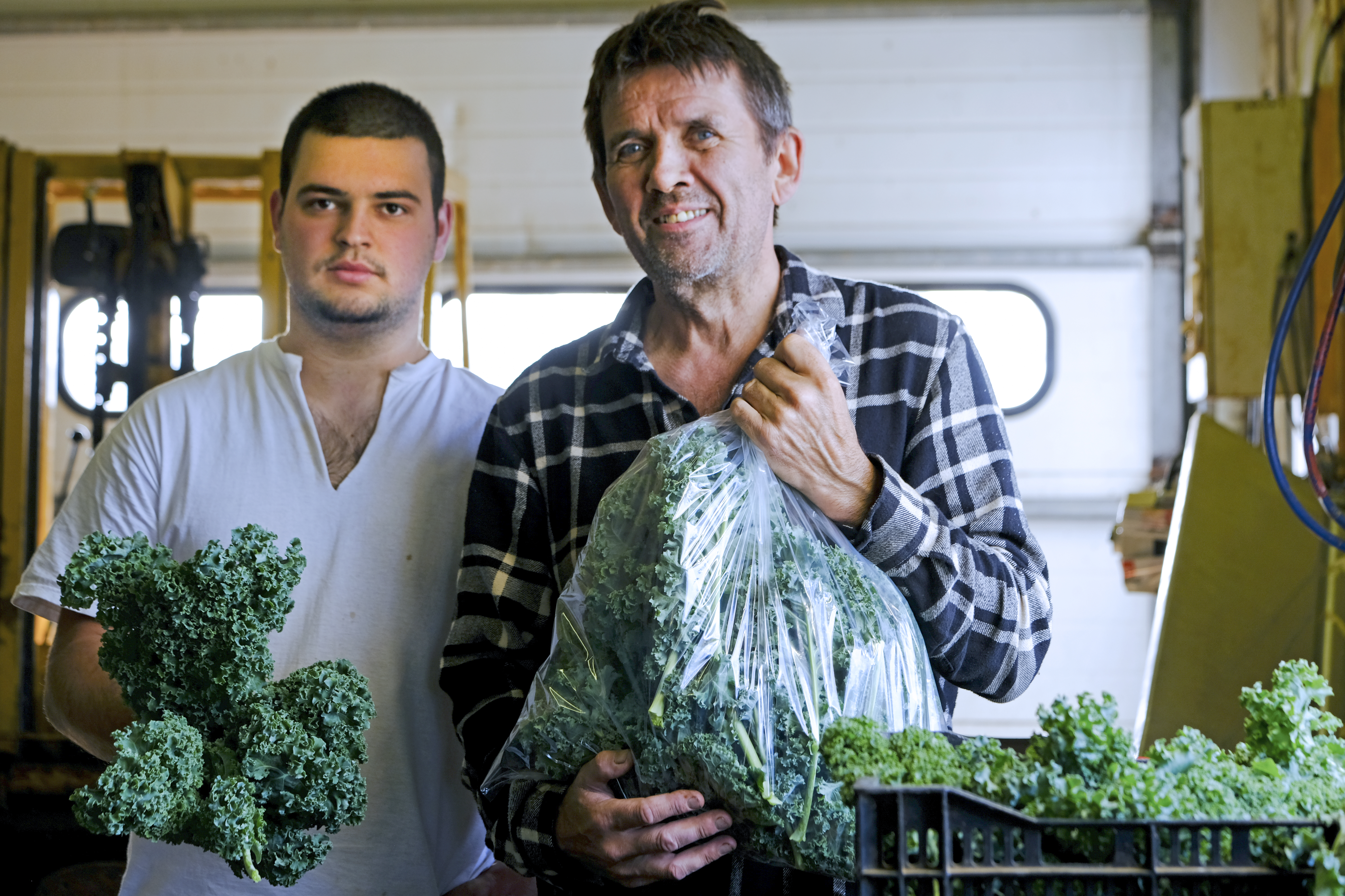 Lukas og Guðmundur Óli við pökkun á grænkáli.