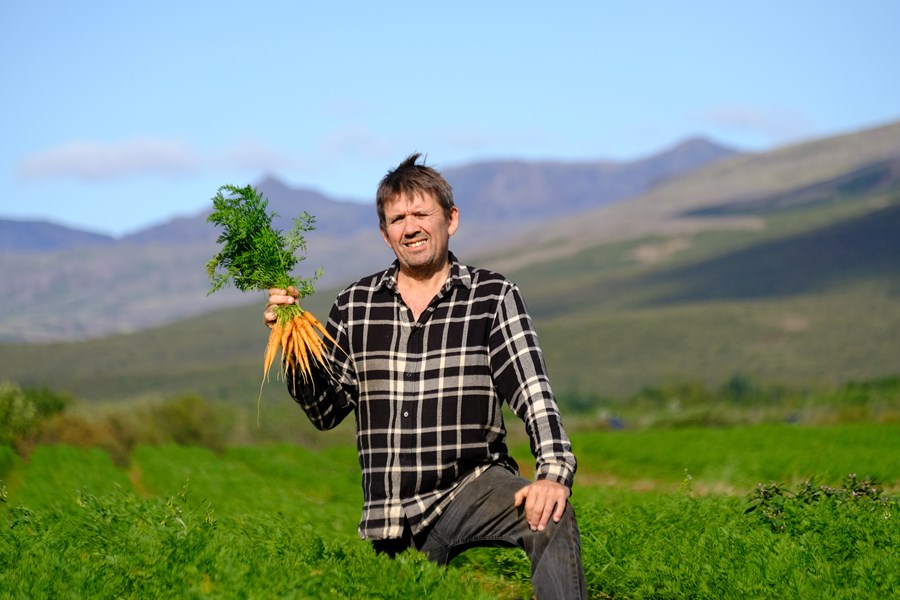 „Ég er með langmest af gulrótum í útiræktun, en líka hvítkál, kínakál og grænkál, sem ég er reyndar líka með inni allan ársins hring. Síðasta árið hef ég sent grænkál frá mér í hverri einustu viku. Mitt grænmeti fer í Bónus og ég læt Banana um að dreifa því fyrir mig og það á að fara í allar verslanir þeirra, sem ég held að séu hátt á þriðja tuginn.