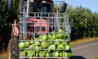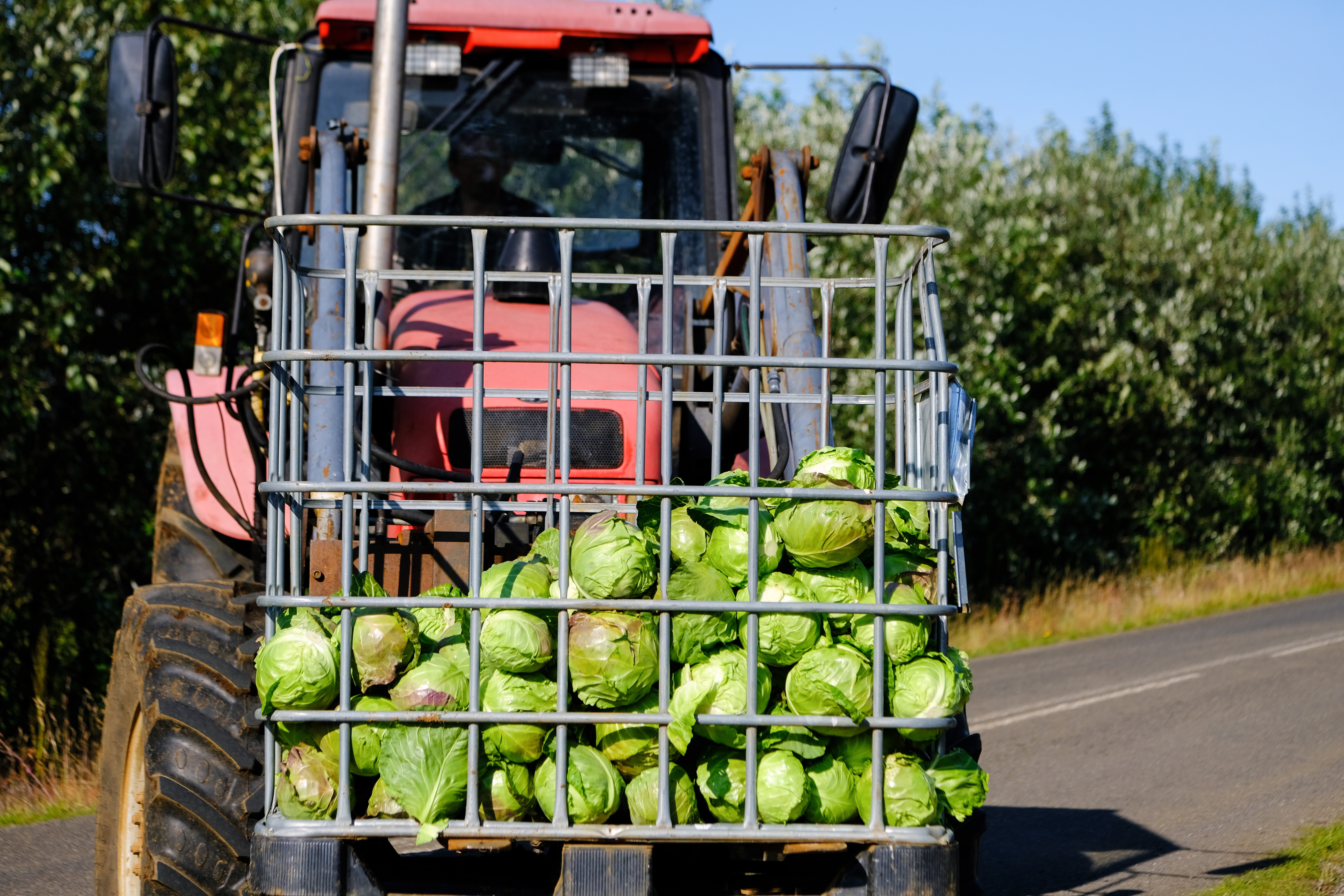 Guðmundur var að skera hvítkál þegar blaðamaður kom í heimsókn og kom með uppskeru morgunsins á traktornum til móts við hann í vinnu- og geymsluskemmunni í Leyni. „Ég tók bara pásu þegar þú hringdir, en eins og þú sérð þá eru þetta fallegir litlir hvítkálshausar sem ég skar upp. Fyrirkomulagið virkar þannig að búðirnar láta vita hvað vanti mikið og ég sker þá bara upp jafnóðum í samræmi við það. Það var beðið um eitt bretti af hvítkáli og tvö bretti af kínakáli eftir helgina og ég var að byrja að uppskera fyrir þá pöntun. Þetta dugar í hálft bretti það sem ég er með hérna. Ég er með góðar kæligeymslur og get geymt bæði hvít- og kínakálið alveg í sex vikur þar inni áður en ég sendi frá mér.“
