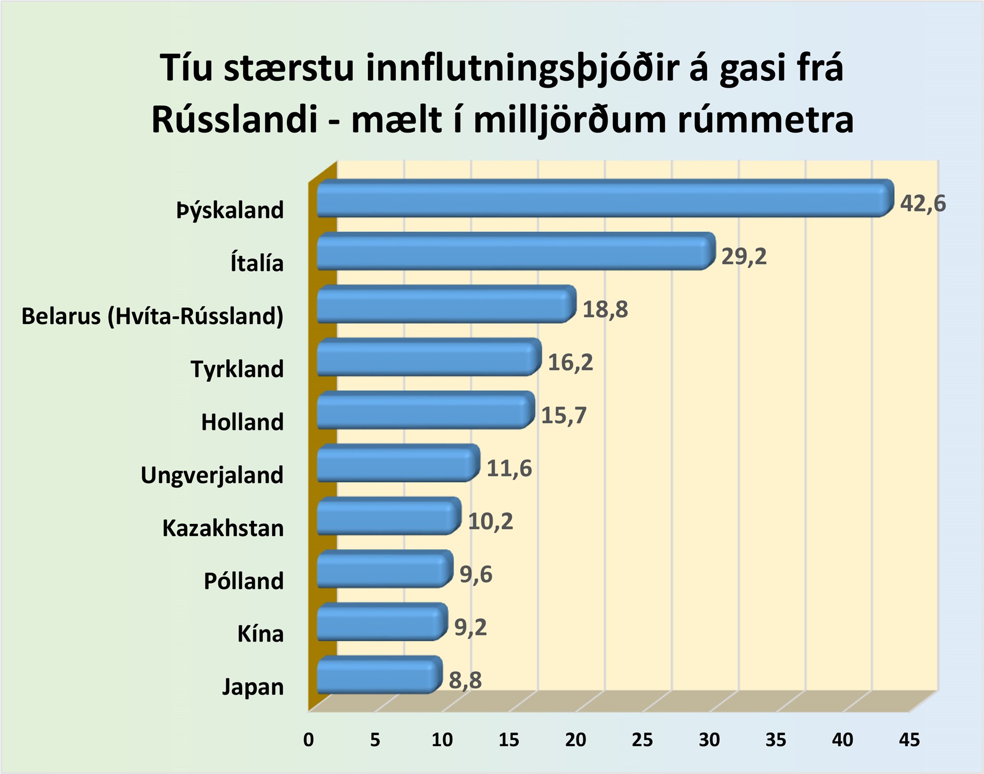 Á blaðamannafundi á mánudag sagði Kadri Simson, yfirmaður orkumála hjá ESB, að stöðvun Rússa á gasbirgðum til Póllands og Búlgaríu hefði styrkt vilja sambandsins til að verða óháð rússnesku jarðefnaeldsneyti. Vandinn er að samkvæmt úttekt rannsóknarmiðstöðvar um orku og hreint loft (CREA) hefur ESB flutt inn um 37 milljarða punda virði af jarðefnaeldsneyti síðan átökin hófust. Mest var flutt inn til Þýskalands, en þar á eftir kom Ítalía.