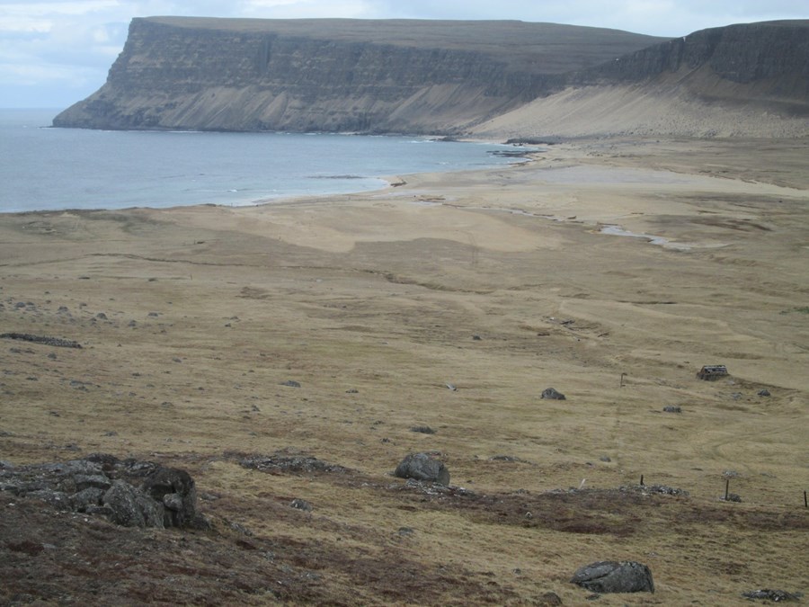 Brimskaflar gengu á land nokkru sunnar og brutu skörð í langan steinhlaðinn garð sem liggur um 300 metra kafla ofan sjávarbakkanna, ævagamall að uppruna og áður óspilltur af sjávarágangi. Ég hef unnið að viðgerðum á þessu mannvirki í samstarfi við Minjastofnun.
