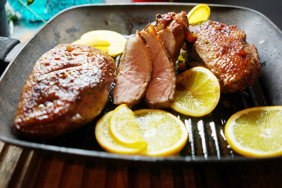 Nuddið öndina með appelsínuberki. Kryddið með salti og pipar.