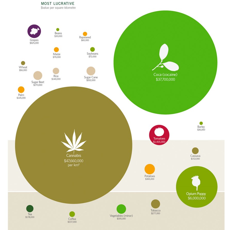 Reyndar er það svo að ef bornar eru saman tölur um verðmæti nokkurra plöntuafurða á ferkílómetra eru þrjár plöntur sem bera af og allar eru þær ólöglegar. Þetta eru kannabis, kókaín og ópíum. Fjórða verðmesta plöntuafurðin eru tómatar.