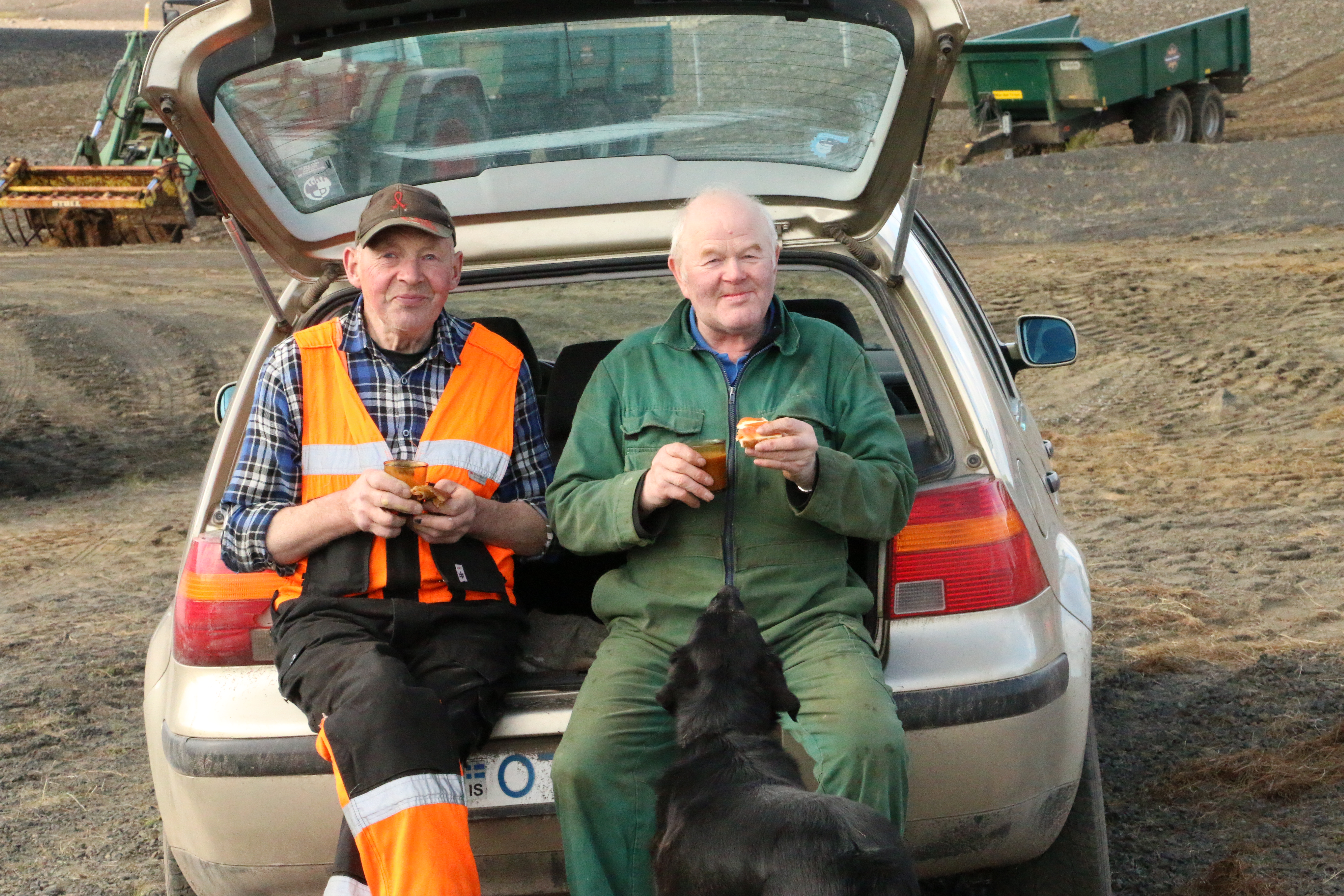 Stefán Eggertsson í Laxárdal og Gunnar Þóroddsson á Hagalandi fá sér kaffisopa.
