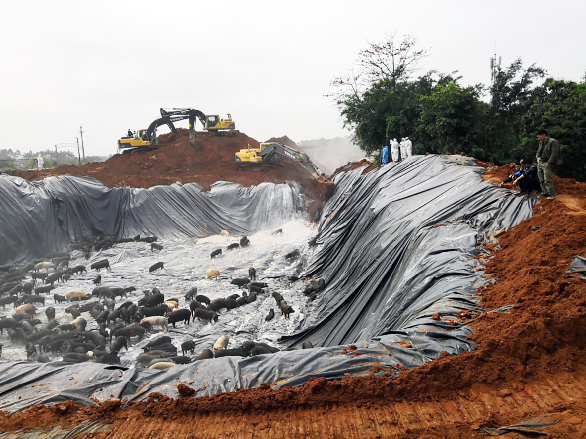 Sýkt svín í Beihai í Guangxi Zhuang-héraði í Kína rekin í gryfju til slátrunar og urðunar þann 19. febrúar 2019.