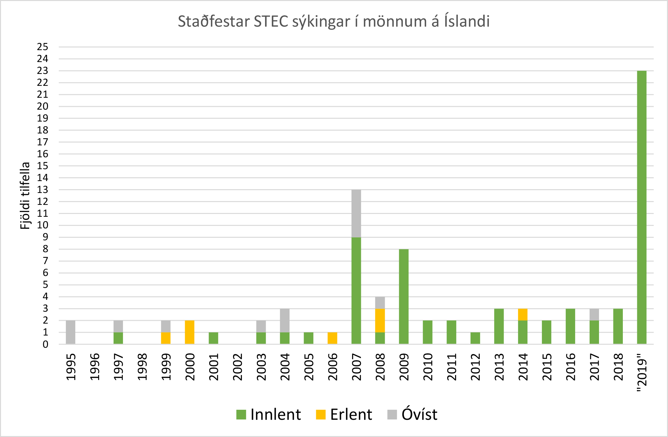 Sýkingar í mönnum af völdum STEC hafa verið sjaldgæfar á Íslandi, 0-2 tilfelli á ári fram til ársins 2006, en 1-3 árin 2010-2018, sjá mynd. Árin 2007 og 2009 skáru sig úr vegna hópsýkinga. Uppruni hópsýkingarinnar árið 2009 hefur enn ekki fundist, en hópsýkingin árið 2007 var vegna mengaðs salats sem var innflutt frá Hollandi. Allt til þessa hefur ekki verið hægt að rekja STEC sýkingar til neyslu innlendra afurða.