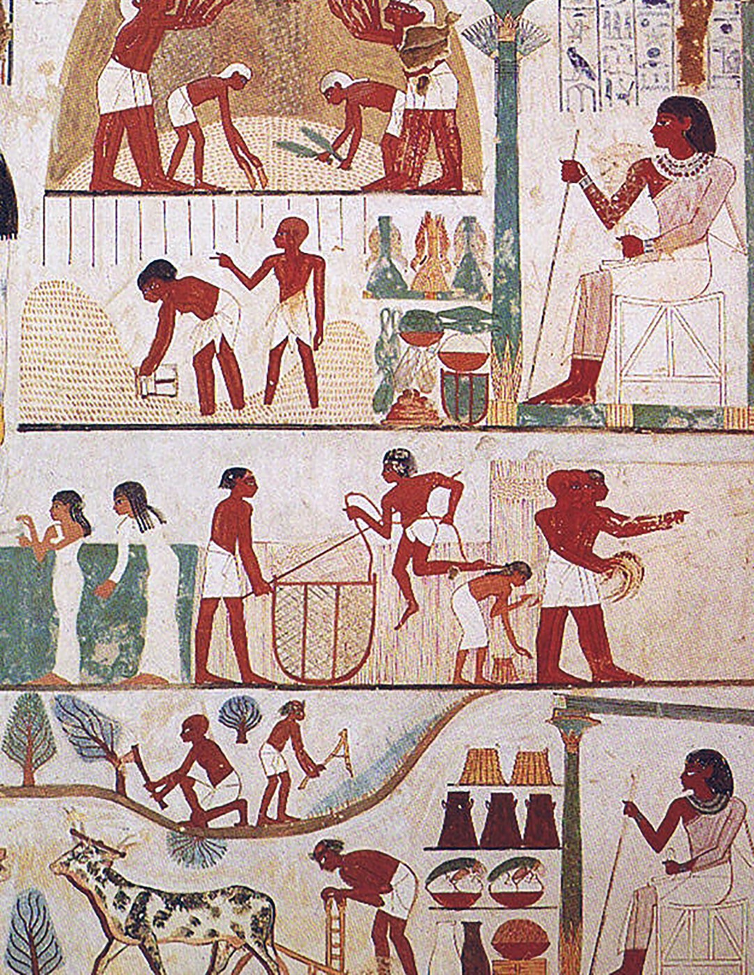 Kornvinnsla, plæging og trjáfelling í Egyptalandi til forna samkvæmt veggmynd sem fannst í grafhýsi frá 15. öld fyrir Krist.