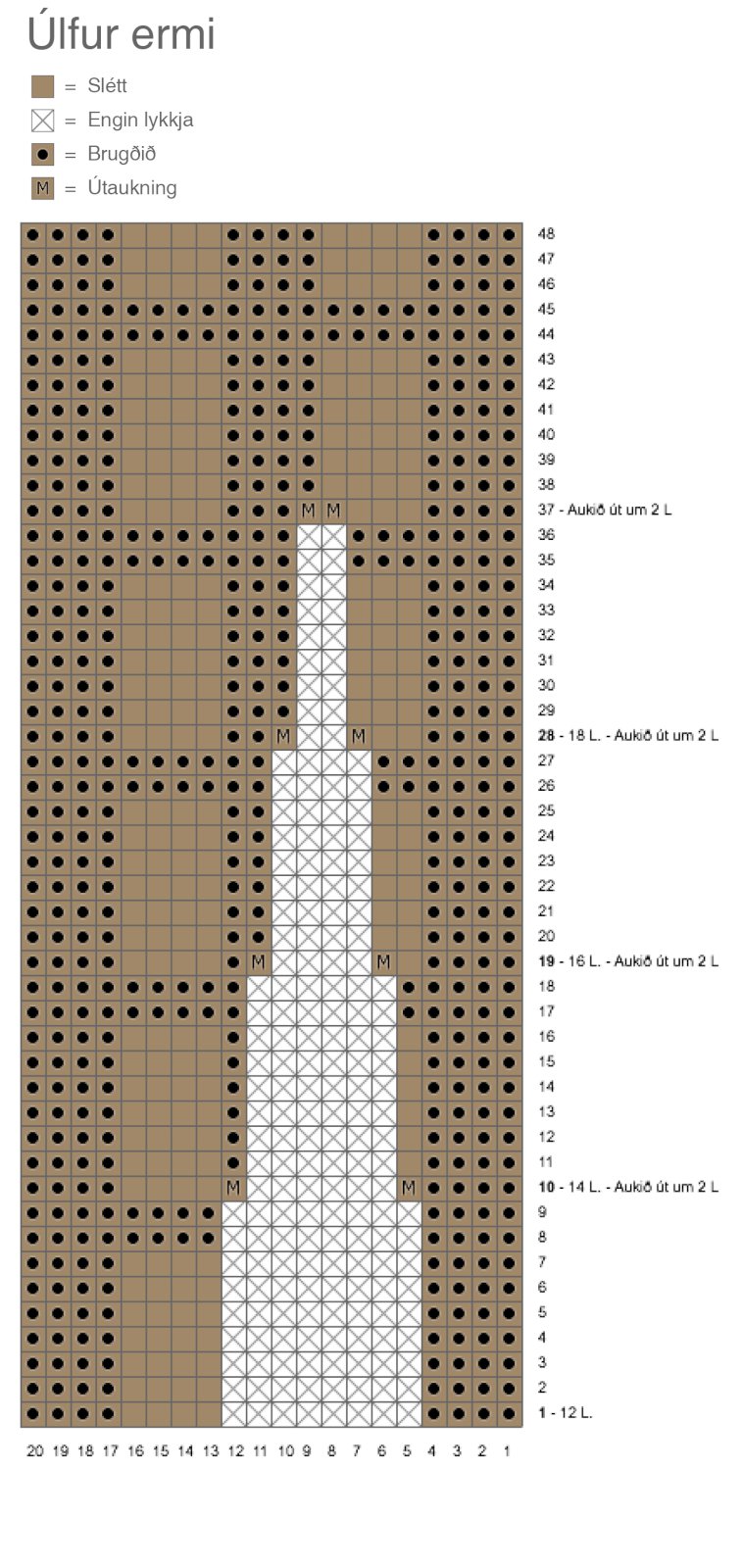 Endurtakið útaukninguna 4 sinnum þannig að komið er heilt mynstur í viðbót í umferðina, líkt og sést á skýringarmynd. Alls eiga þá að vera 48 (56) L á prjónunum.