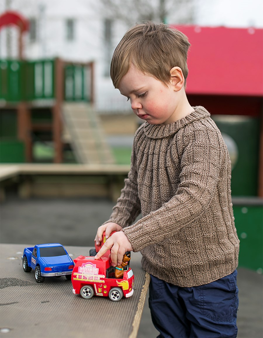 Endurtakið *-* 7 (8) sinnum eða þar til peysan passar á barnið upp að handvegi, passið að enda á 2 umf brugðið.