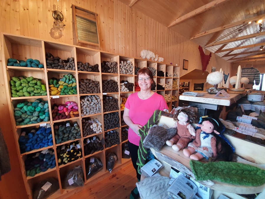Á loftinu er líka verslun, sem er smá í sniðum, en þar er Hulda fyrst og fremst með garnið sitt til sölu og fleira áhugavert, sem tengist kindum eða prjónaskap.