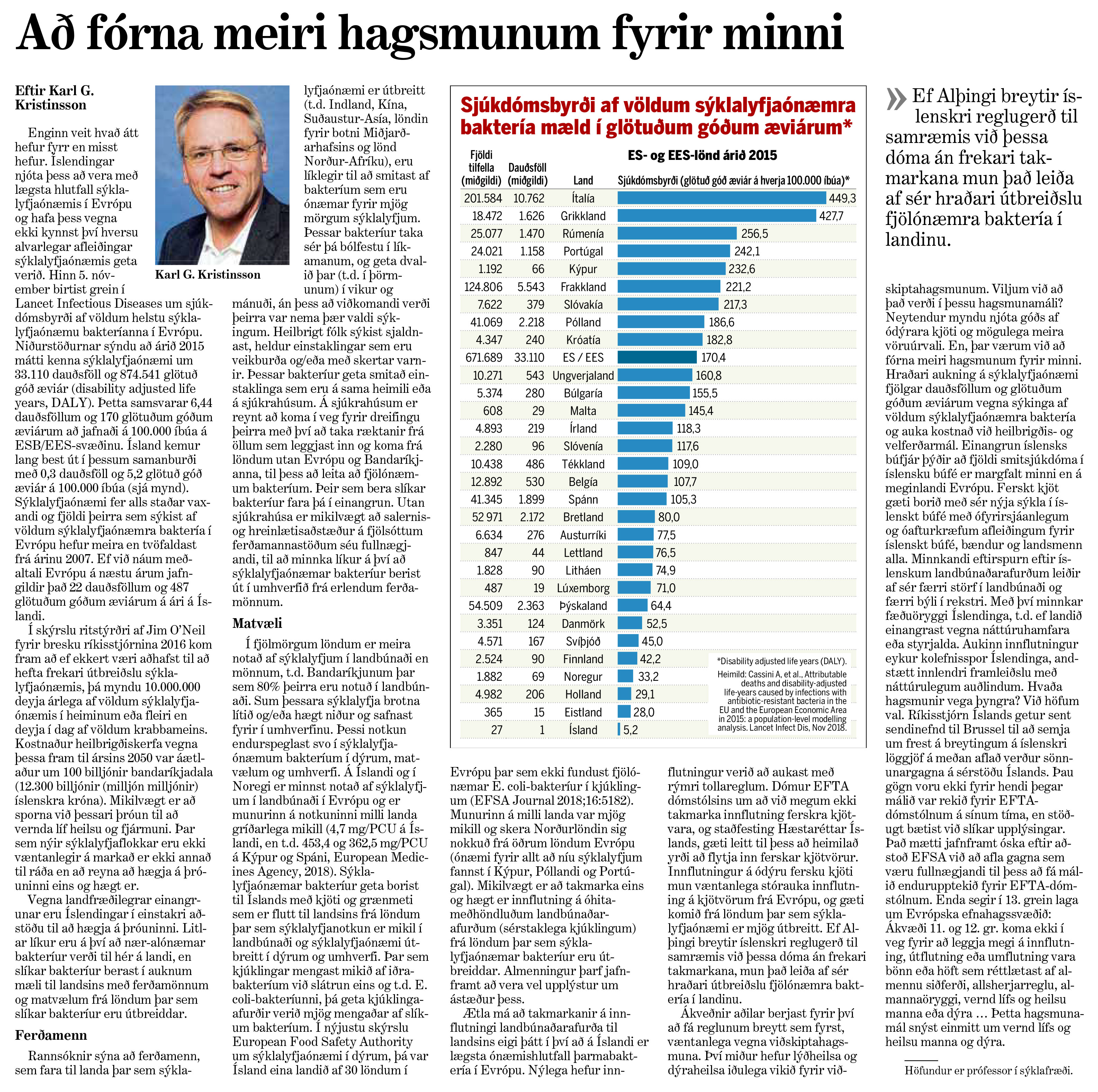 Karl G. Kristinsson, prófessor við Háskóla Íslands og yfirlæknir á sýklafræðideild Landspítalans, ritar grein sem birtist í Morgunblaðinu í dag undir yfirskriftinni „Að fórna meiri hagsmunum fyrir minni“. Þar fjallar Karl um sýklalyfjaónæmi og vaxandi vandamál sem fylgja auknum óviðráðanlegum sýkingum í mannfólki um allan heim. Vitnar Karl í nýbirta grein í læknatímaritinu Lancet þar sem sagt er frá sjúkdómsbyrði af völdum helstu sýklalyfjaónæmu bakteríanna í Evrópu.