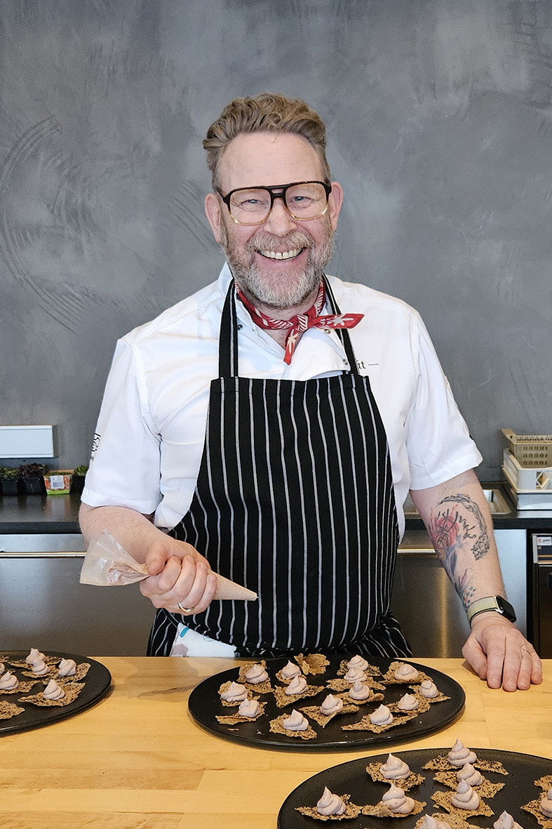 Ólafur Ólafsson, veitingamaður á Brút, leggur síðustu hönd á framreiðslu vistkjöts úr stofnfrumu japanskrar kornhænu.