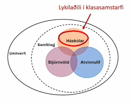 Grunnmynd af klasasamstarfi: háskólar, stjórnvöld, atvinnulíf, samfélag og umhverfi. Slík þverfagleg nálgun er sögð mikilvæg í nýsköpun. Mynd / Skjáskot-hs