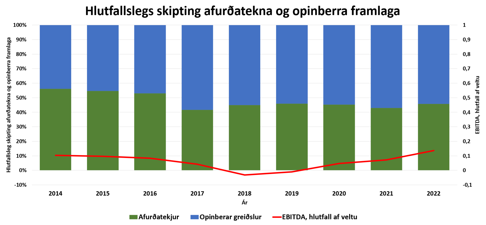 Mynd 1 - Hlutfallslega skipting afurðatekna og opinberra greiðslna eftir árum frá árinu 2014. Rauða línan sýnir EBITDA sem hlutfall af veltu sauðfjárræktar eftir árum.”