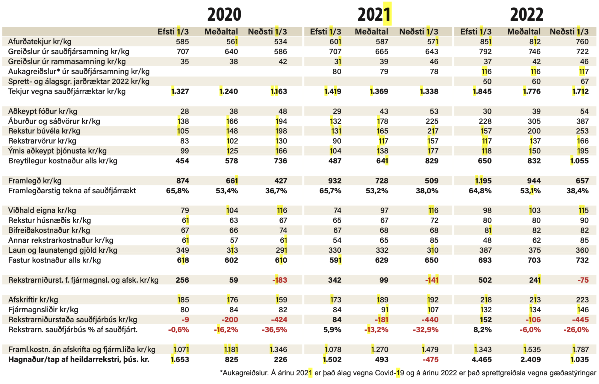 Framleiðslukostnaður dilkakjöts að meðtöldum fjármagnsliðum og afskriftum er 1.882 kr./kg árið 2022. Merki eru um bætta afkomu þátttökubúanna árið 2022 en þau tengjast að nokkru leyti hækkun á afurðaverði og einskiptisgreiðslum frá ríki, en einnig af auknum tekjum af öðru en sauðfjárrækt.