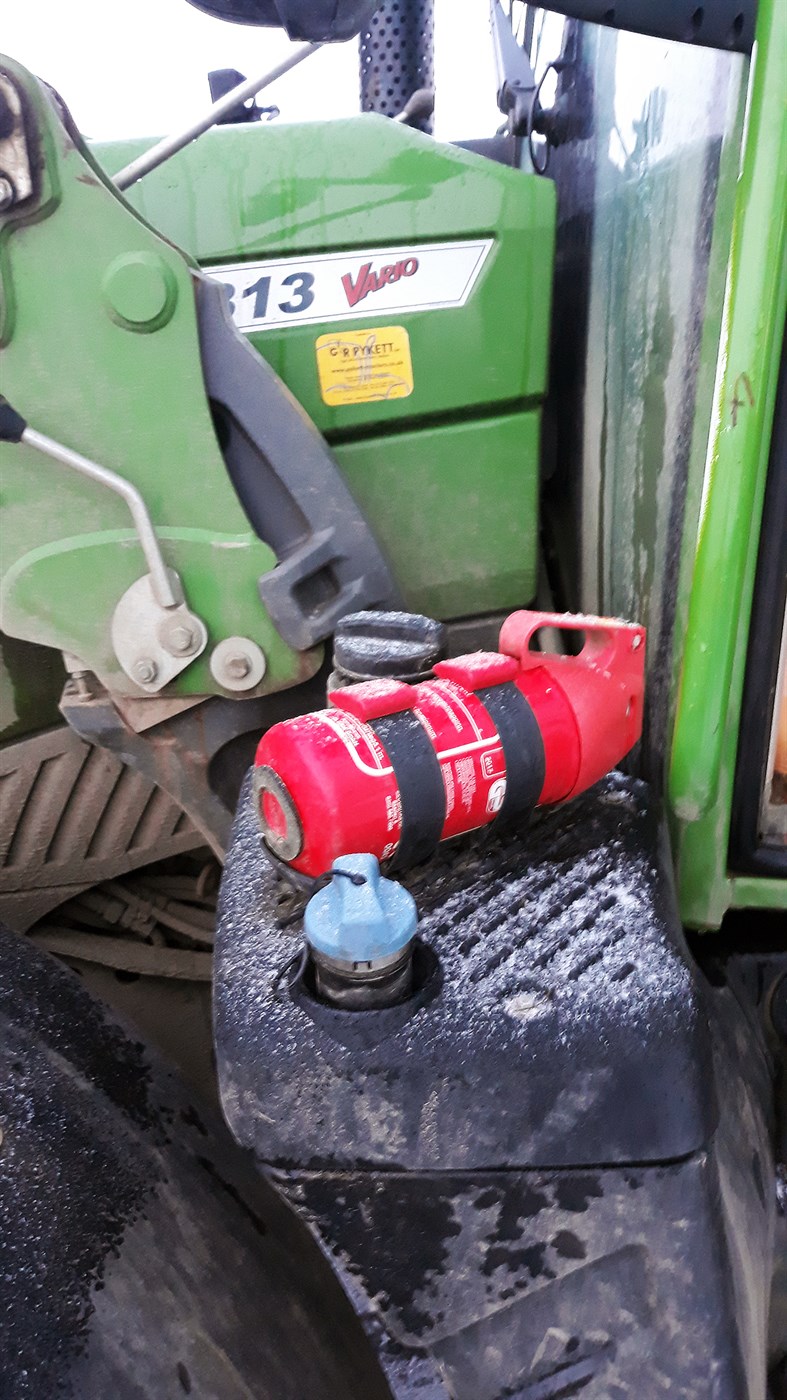 Slökkvitæki utan á traktor, en er þetta tæki auðlosanlegt?