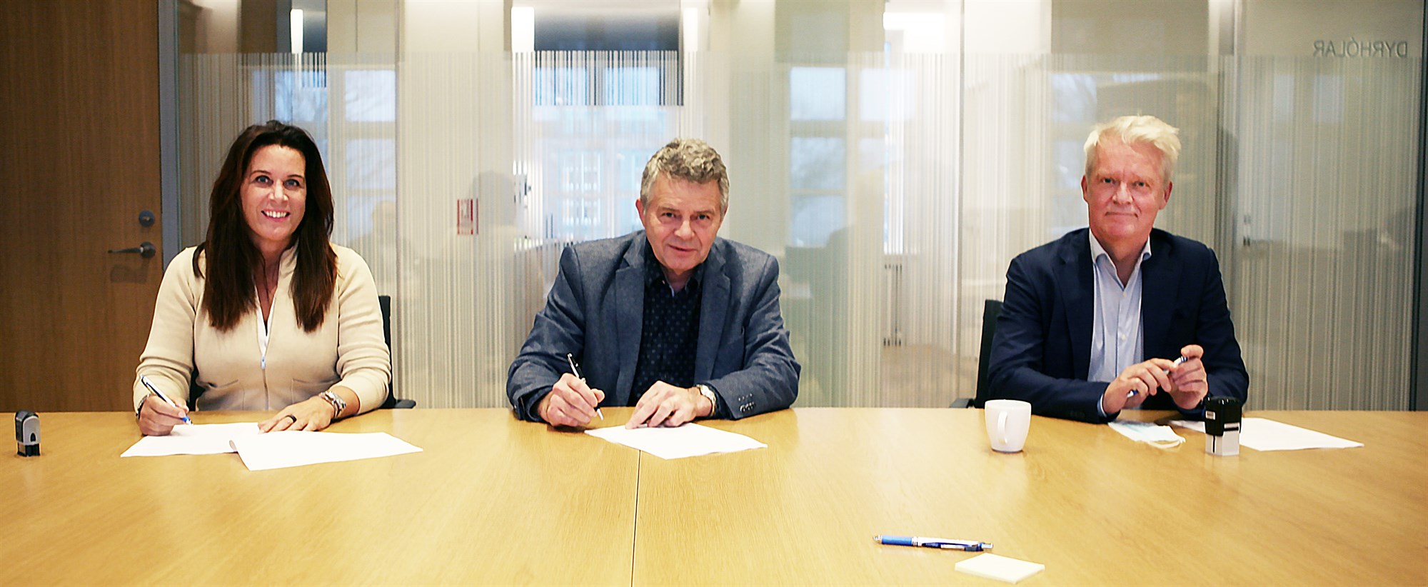 Frá undirritun samninga í fjármálaráðuneytinu Arnarhváli. Talið frá vinstri; Guðrún Björnsdóttir, framkvæmdastjóri Félagsstofnunar stúdenta, Gunnar Þorgeirsson formaður Bændasamtaka Íslands, Guðmundur Árnason, fulltrúi fjármálaráðuneytisins. Mynd / VH