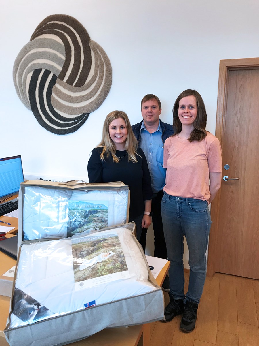 Sigríður Jóna Hannesdóttir verkefnastjóri, Rebekka Kristjánsdóttir sölustjóri og Sigurður Sævar Gunnarsson, framkvæmdastjóri Ístex, með nýju íslensku ullarsængina.