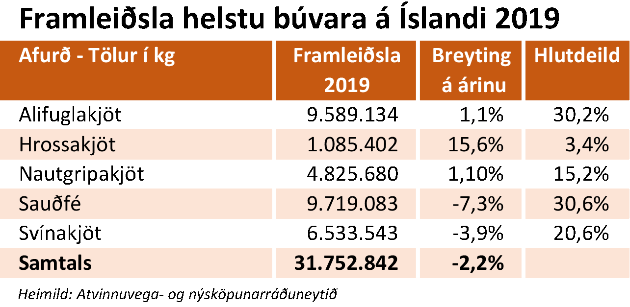 Samkvæmt tölum frá afurðastöðvum var heildarframleiðsla á kjöti á árinu 2019 samtals tæp 31.753 tonn. Þar var mest framleitt af sauðfjárafurðum, eða rúmlega 9.719 tonn, sem er reyndar 7,3% samdráttur frá 2018. Þá kom alifuglakjöt, en af því voru framleidd um 9.589 tonn sem er aukning upp á 1,1% á milli ára. Svínakjöt var í þriðja sæti með um 6.534 tonn, en þar varð samdráttur í framleiðslu upp á 3,9%. Í fjórða sæti var framleiðsla á nautgripakjöti sem nam um 4.826 tonnum sem er aukning upp á 1,1%. Hrossakjötsframleiðslan var svo í fimmta sæti með um 1.085 tonn, en þar var 15,6% aukning í framleiðslu.