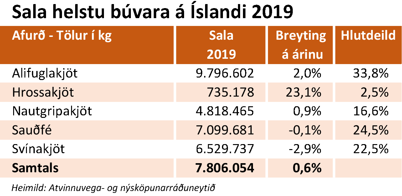Samkvæmt tölum frá starfsfólki í atvinnuvega- og nýsköpunarráðuneyti, sem áður tilheyrði Búnaðarstofu, var um að ræða 2% aukna sölu á íslensku alifuglakjöti. Þá var um 0,9% aukning í sölu á nautakjöti og veruleg aukning í sölu hrossakjöts, eða um 23,1%.