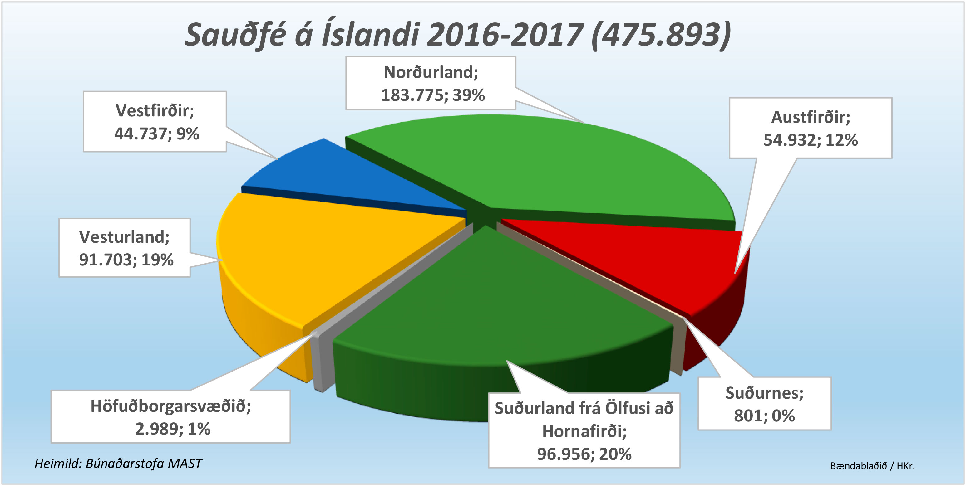 Sauðfé hefur fækkað mikið á Vestfjörðum en þar eru nú samkvæmt tölum MAST 44.737 kindur. Á Austfjörðum hefur fækkun sauðfjár líka orðið mikil og eru þar nú 54.932 skepnur. Fæst er sauðfé þó á höfuðborgarsvæðinu þar sem einungis eru 2.989 fjár.
