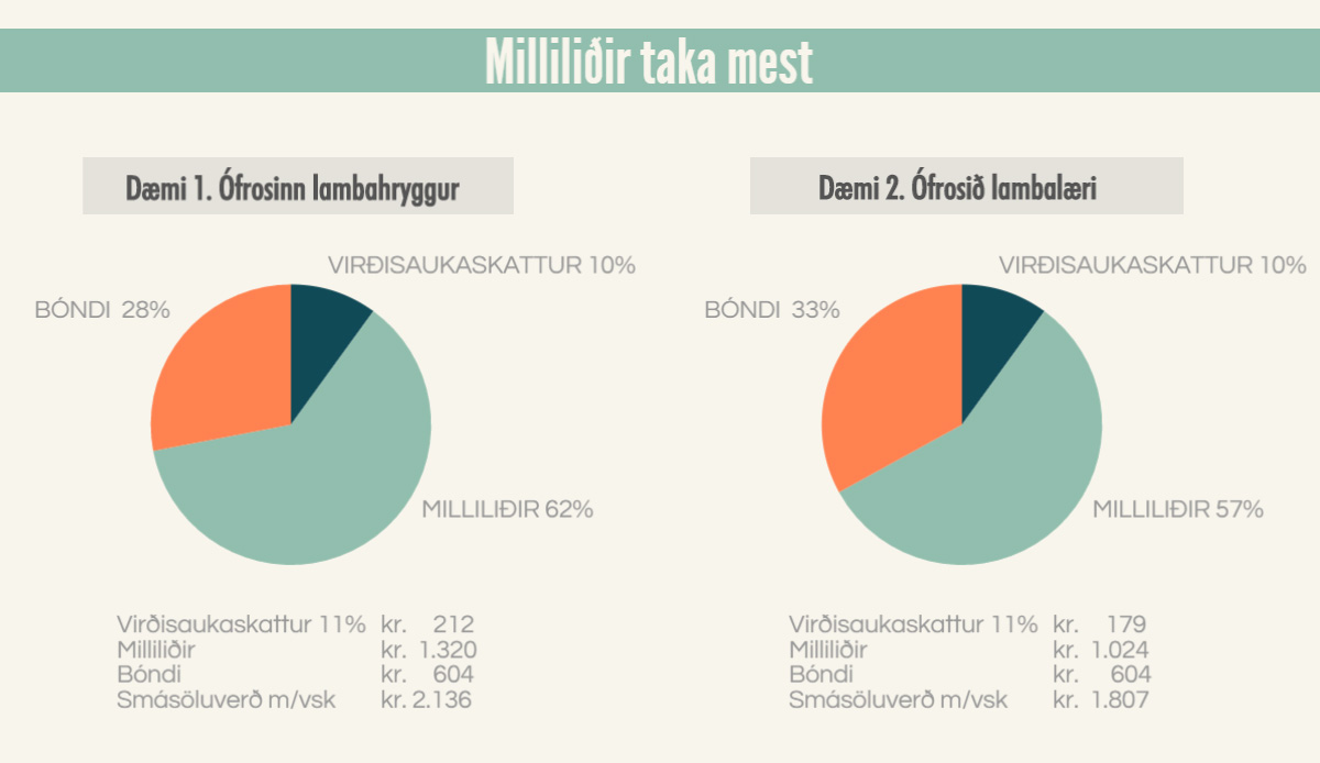 Algengt er að íslenskir bændur fái sem nemur á bilinu 25% til 41% af endanlegu útsöluverði lambakjöts í sinn hlut. Þegar tekið hefur verið tillit til 11% virðisaukaskatts þýðir þetta að milliliðir; sláturhús, kjötvinnslur og verslanir taka á bilinu 49% til 65% af endanlegu útsöluverði á lambakjöti til sín.