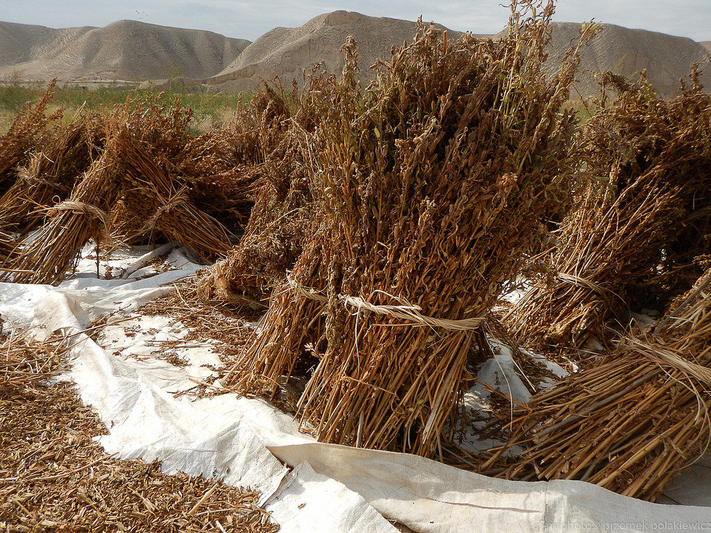 Stráum sesamplöntunnar er safnað saman í knippi sem standa upp á endann. Fræin eru hrist úr knippunum eftir að þau hafa náð þroska.