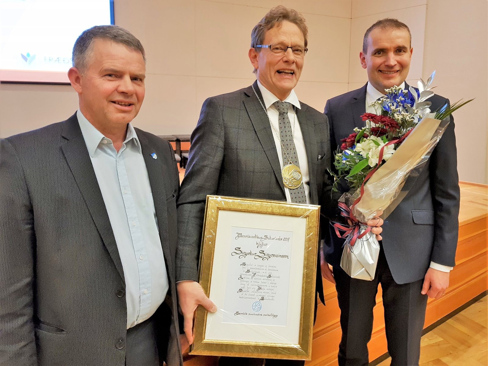Sigurður með viðurkenninguna og blómvönd, ásamt Gunnari Þorgeirssyni, formanni stjórnar SASS, og hr. Guðna Th. Jóhannessyni, forseta Íslands.