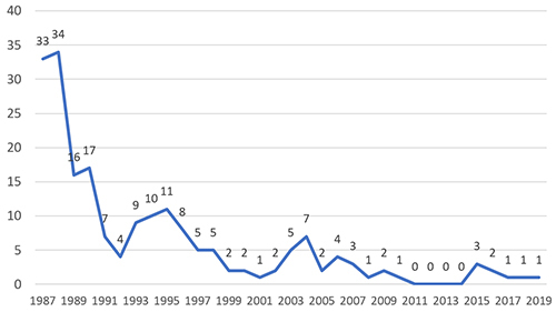 Fjöldi staðfestra riðutilfella frá árinu 1987. Mynd / Matvælastofnun