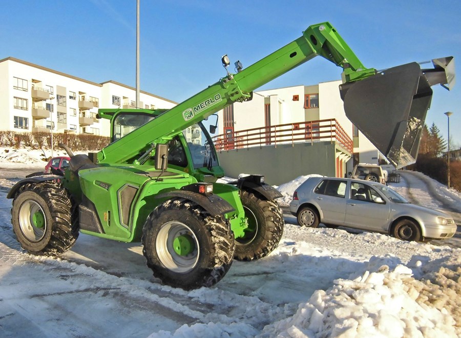 Vélin hefur ekki útlit venjulegra traktora og að sjá ekki traktorsleg, en að mínu mati er hér framtíðar traktorinn. Kunningi minn, Keran Stueland Ólason í Breiðavík, er að fá Merlo-traktor frá Íslyft. Ég fékk leyfi hjá Keran til að prófa gripinn áður en hann yrði sendur vestur í Breiðavík.