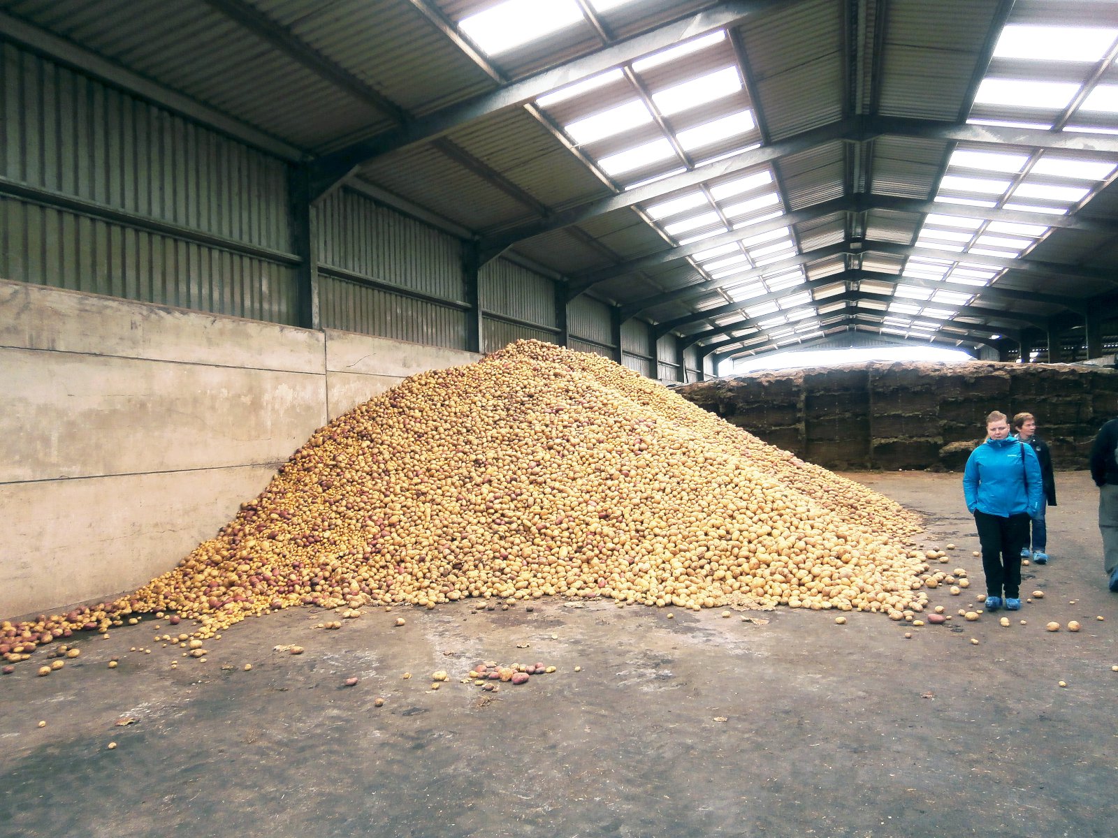 Kartöflurnar þarf því alls ekki að spara og fá gripirnir frjálst aðgengi að kartöflum daginn út og inn og taldi John að líklega færu að jafnaði 50 kíló af kartöflum á dag í hvern grip, þegar afföll og moð væri tekið með inn í reikninginn. Þá er einnig gefið svolítið vothey og örlítið gerjunarhrat frá viskíverksmiðju í nágrenninu. Með aðgengi að þessu kraftmikla en ódýra fóðri ná gripirnir að bæta vel á sig síðustu mánuðina og þyngjast þeir að jafnaði um 1,3 kíló að dag. Auk þess að fóðra gripi inni eru nokkrir gripir hafðir úti á beit. Þeir gripir eru seldir á markaði með öðrum hætti, enda hafa þeir fengið annars konar eldi og því hægt að markaðssetja kjötið sem slíkt.