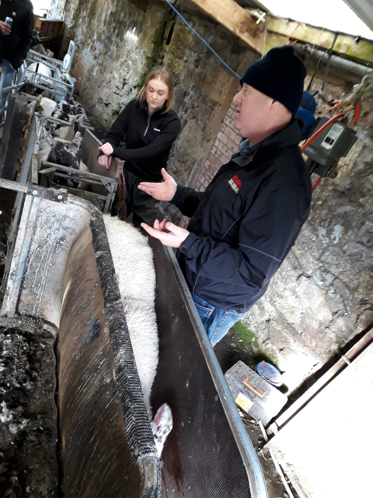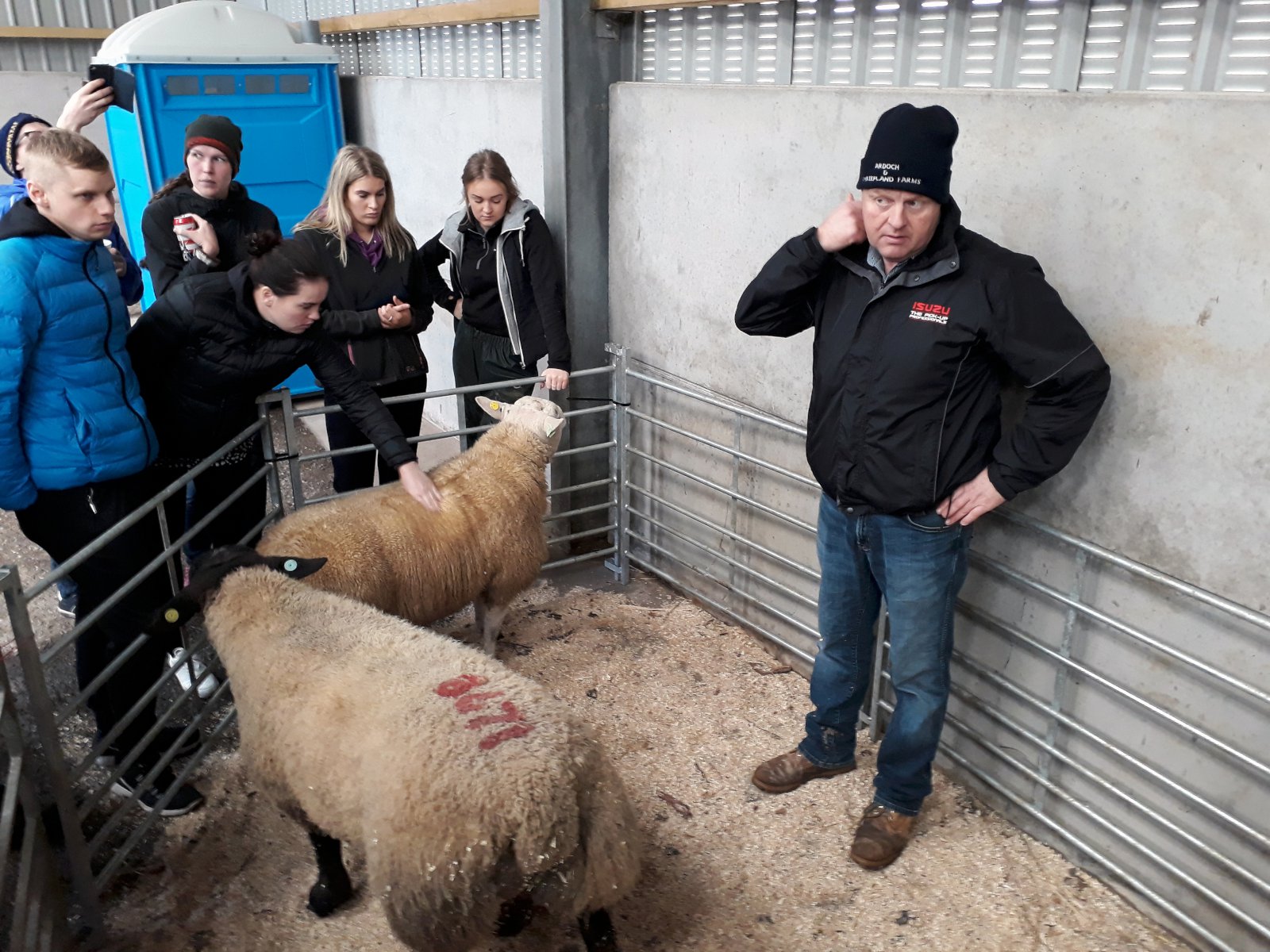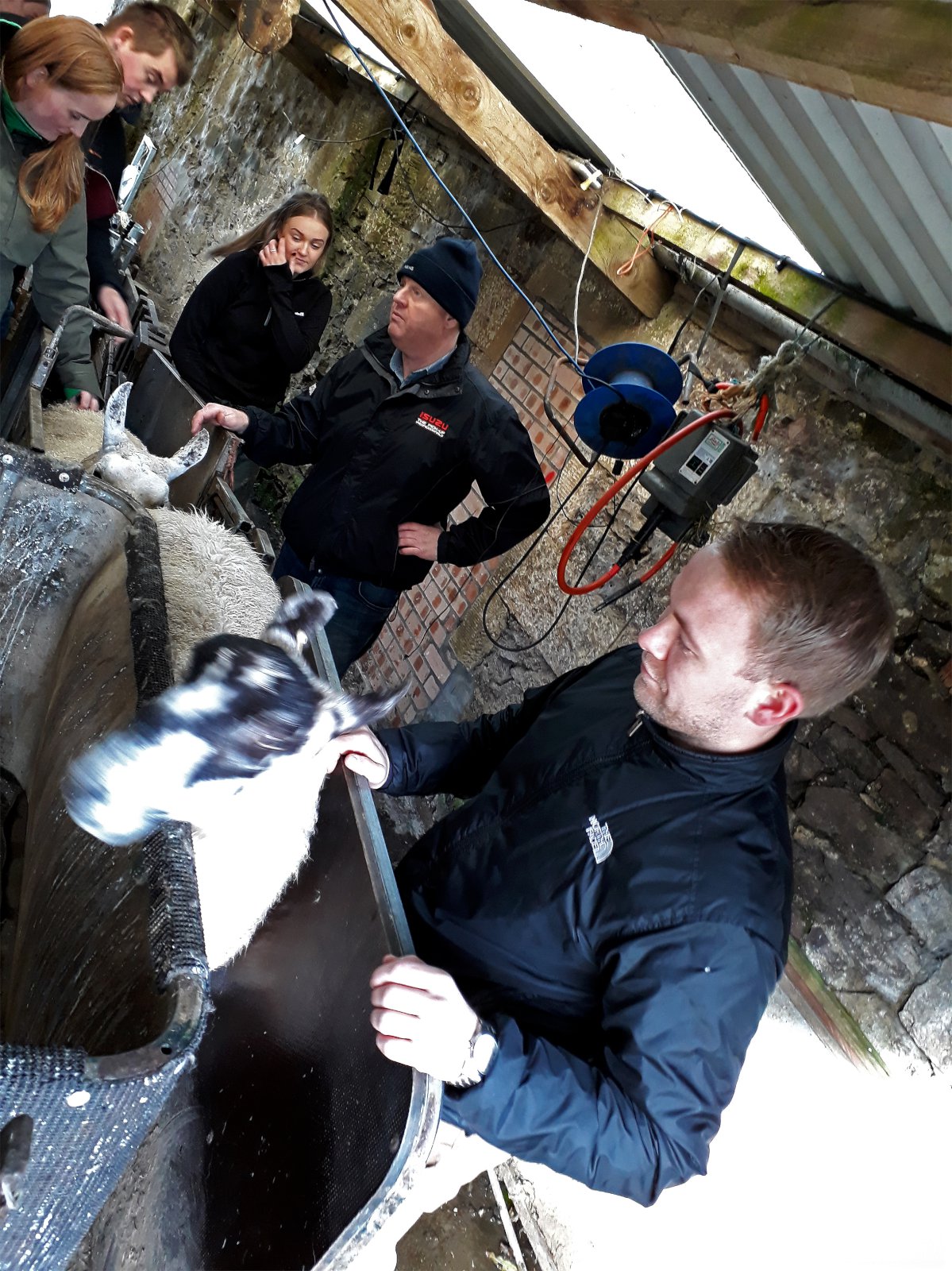 Margir í hópnum höfðu orð á því að búið kæmist af með afar takmarkað vinnuframlag en þau Iain og Marion sögðu þá að það væri m.a. sérstakri flokkunargrind að þakka! Þessi grind sparaði þeim hreinlega aukamann eða tvo við fjárrag og vinnu við ærnar og fékk hópurinn að sjá þetta ómissandi hjálpartæki búsins. Þessi flokkunargrind er afar einföld í notkun og algjörlega handvirk. Þegar kindin kemur inn í grindina, stígur bóndinn á pall og með vogarafli og þunga bóndans leggst grind með mjúku efni á upp að hlið kindarinnar og er hún þá föst. Þá er einfalt að holdastiga, skoða klaufir, gefa lyf eða hvað annað það sem gera þarf. Einar Freyr Elínarsson, formaður Samtaka ungra bænda á Íslandi, fékk að prófa og líkaði vel eins og sést á meðfylgjandi mynd.
