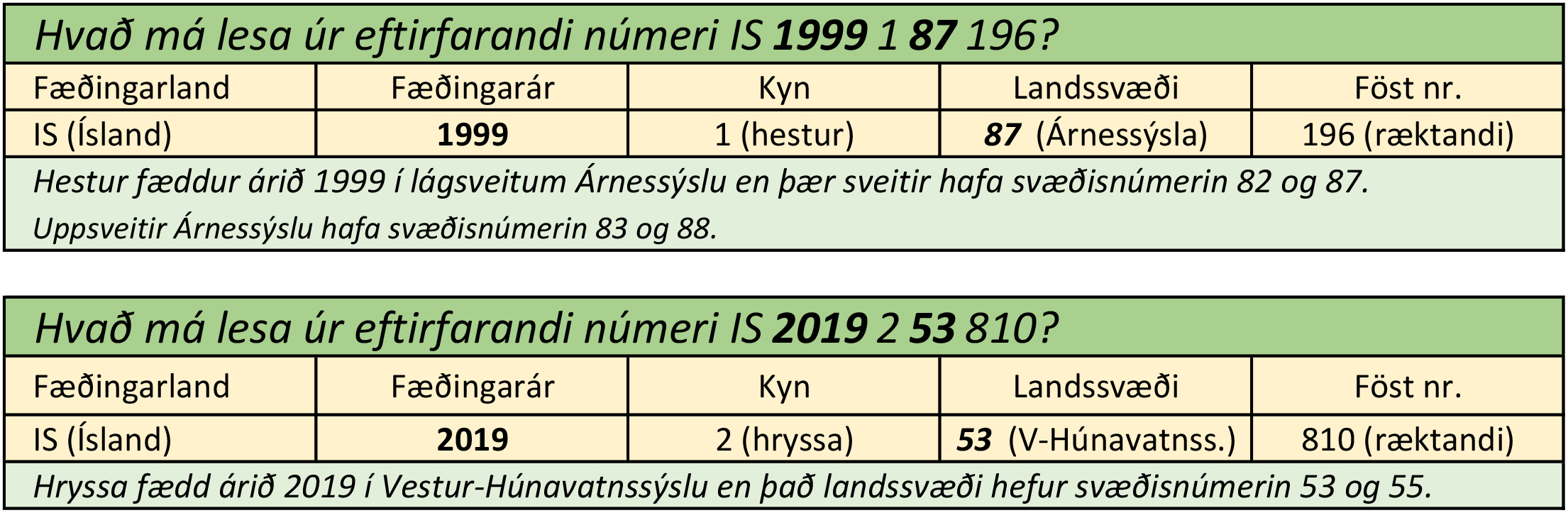 Fæðingarnúmer (IS-númer) er í raun kennitala hestsins. Út úr fæðingarnúmerinu má lesa fæðingar­land, fæðingarár, kyn, landssvæði sem hrossið er upprunnið á og fast númer ræktanda. Eins og þegar hefur komið fram eru föst númer þau númer sem viðkomandi ræktanda er úthlutað um leið og hann gerist þátttakandi í skýrsluhaldi. Í meðfylgjandi töflum eru tekin tvö dæmi.