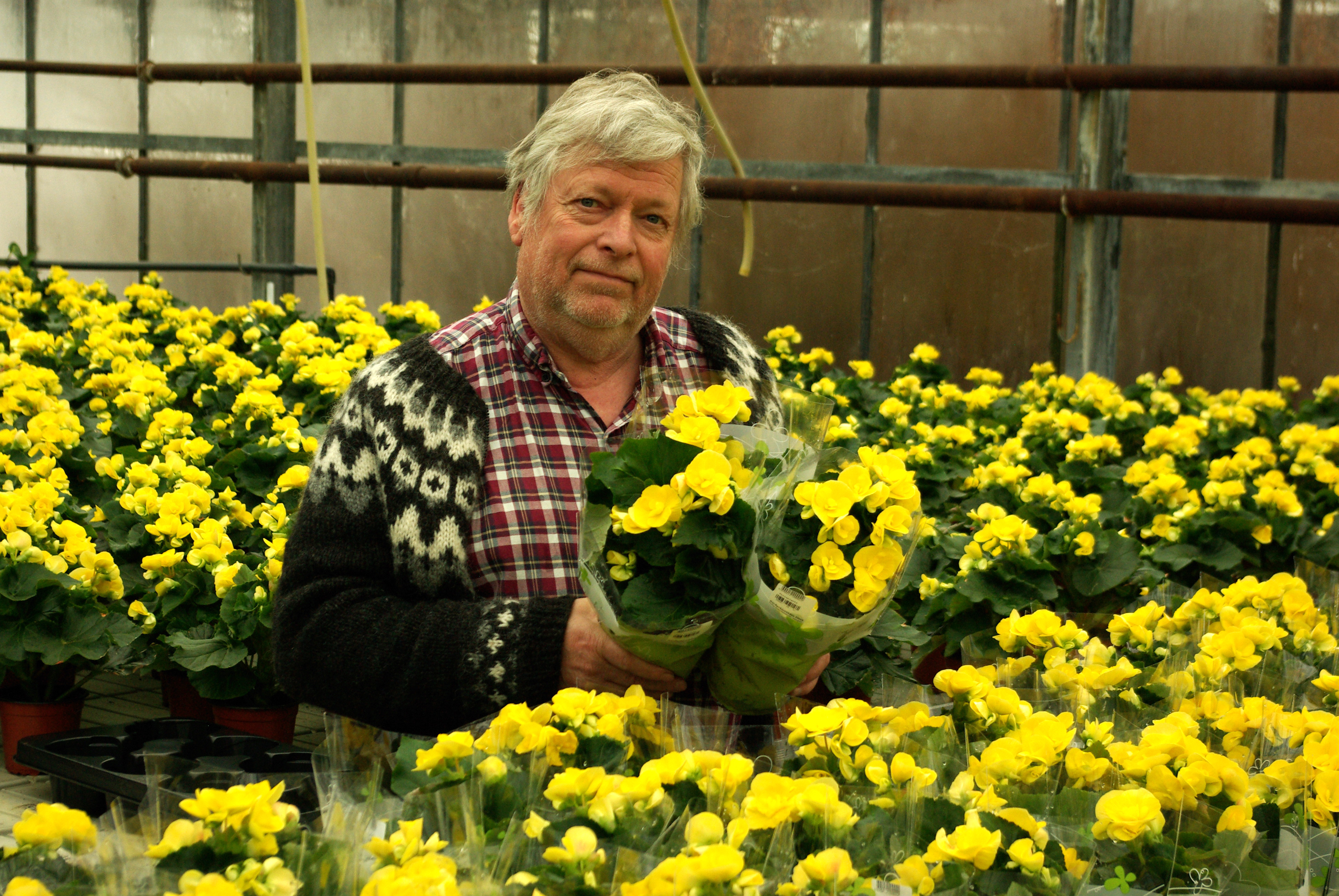 „Fyrsta gula blómið sem fór á markað frá mér var begónía sem við fáum sem rótaða græðlinga frá Hollandi snemma í janúar. Begóníur eru virkilega harðgerðar plöntur og blómviljugar sem hæglega má halda áfram með og hafa úti í potti yfir hásumarið og taka svo inn yfir veturinn ef fólk vill.“