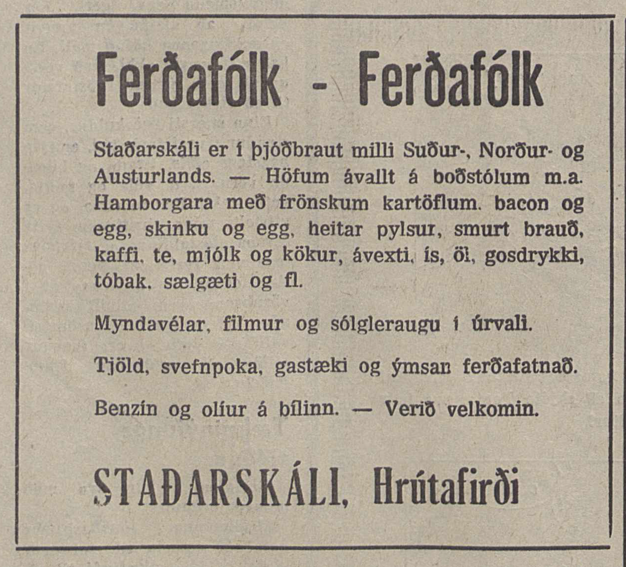 Hinn vinsæli Staðarskáli, sem í dag býður upp á heimilismat, grillrétti og skyndibita af ýmsu tagi, birti auglýsingu í Tímanum árið 1969 og auglýsti þar einstakt úrval til verslunar, bæði matarkyns og annars. Var þar m.a. talið upp franskar kartöflur, beikon, skinka og egg, heitar pylsur, ávextir, ís, öl, tóbak og svo myndavélar, filmur, sólgleraugu, tjöld, svefnpokar, gastæki og ýmislegt fleira. Hálfrar aldar saga Staðarskála hefur haldið velli í gegnum árin en umskipti urðu á húsnæðinu árið 2008. Var það vegna breytingar á veglínu að gamli skálinn fór úr alfaraleið og því byggður nýr þar sem mætast hringvegurinn og vegurinn norður á Hólmavík og Strandir og til Norðurlands vestra.