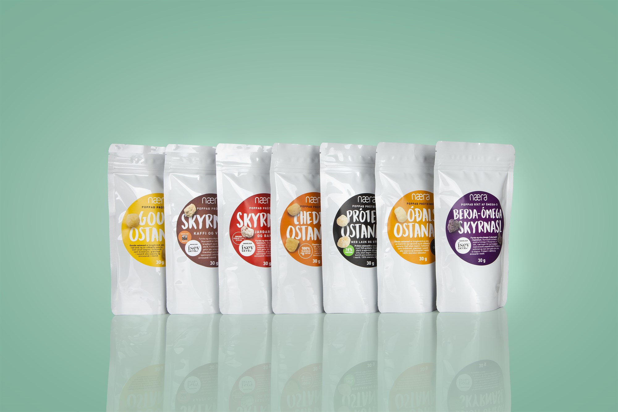 Það er ekki bara skyrnaslið sem RF vinnur að, mörg járn eru í eldinum. RF er með vörumerkið NæraTM, sem það markaðssetur vörur sínar undir. „RF hefur þróað einstakt poppað ostanasl sem unnið er úr 100 prósent íslenskum osti sem það fær frá Mjólkursamsölunni. Fyrirtækið er einnig að þróa umbyltandi nasl úr mismunandi sjávarfangi sem hefur þann eiginleika að hafa allt góða bragð fisksins en er alveg laust við fiskilykt, sem opnar á alveg nýjan hóp neytenda, sérstaklega á erlendum mörkuðum,“ segir Holly, spurð um vörutegundirnar sem eru á snærum Næra.