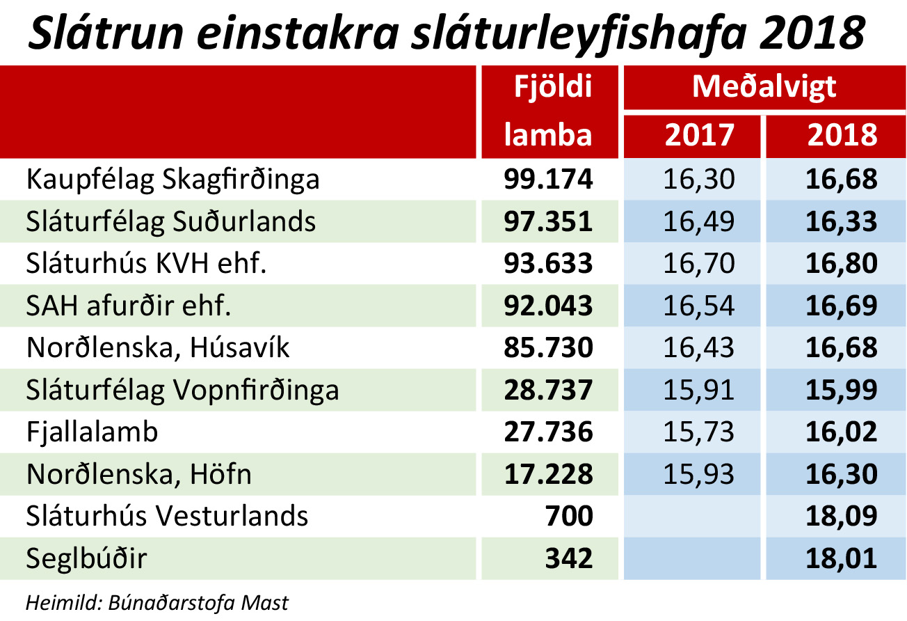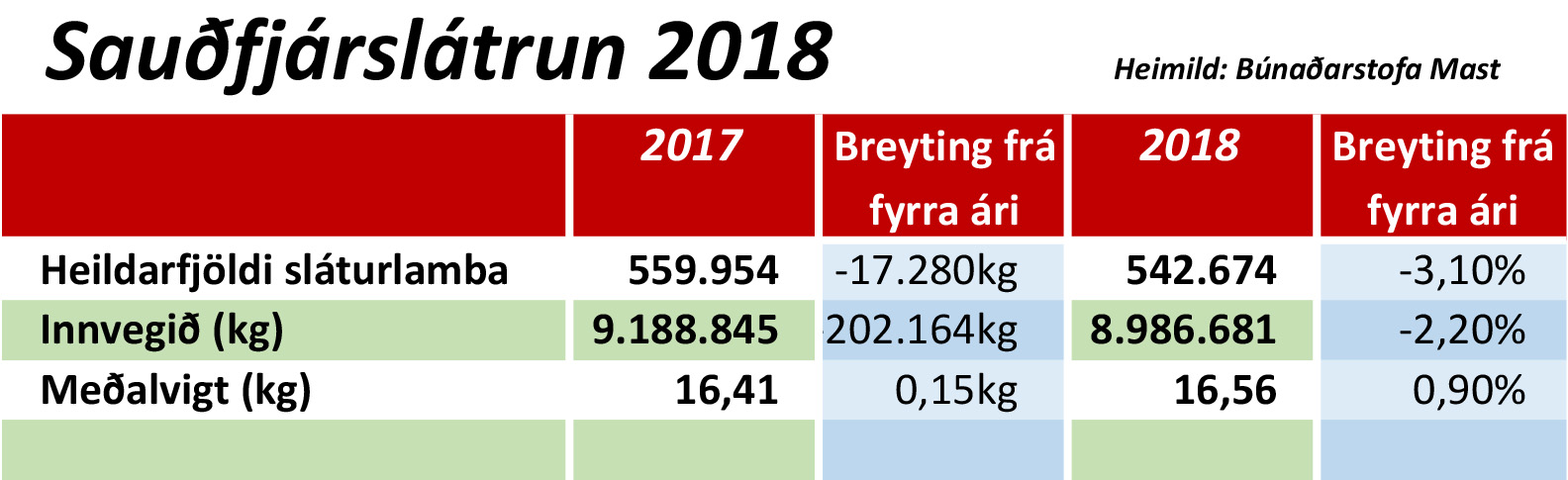 Meðalfallþungi dilka á nýliðinni sláturtíð var 16,56 kíló, sem er 0,15 kílóum meira en á síðasta ári. Heildarfjöldi sláturlamba hefur aftur á móti dregist saman úr 599.954 árið 2017 í 542.674 árið 2018.
