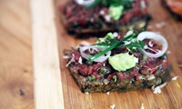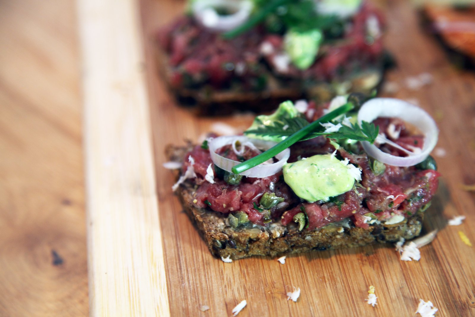 Snyrtu nautalundina og skerðu hana í fína teninga. Saxaðu skalotlaukinn, graslaukinn og kapersið fínt. Blandaðu öllu hráefninu saman í skál, bætið í olíu, salti og pipar og dijon sinnepi. Sprautið majónesið ofan á réttinn.