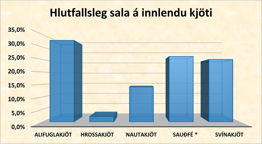 Dæmið breytist þó töluvert þegar horft er á sölu á íslenska markaðnum. Þar er innlenda kjúklingakjötið sterkast með rúmlega 8 þúsund tonn eða 32,6% hlutdeild. Kindakjötið er með 26,2% af sölunni. Misvægi í framleiðslu- og sölutölum á kindakjöti markast trúlega af útflutningi og hugsanlega einhverri birgðasöfnun. Síðan kemur svínakjötið með 25% markaðshlutdeild, nautakjöt með 14% og hrossakjöt er með 2,2% hlutdeild. Hafa ber í huga að þarna er verið að tala um markaðshlutdeild innanlands á innlendri framleiðslu.