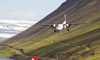 Fokker Friendship flugvél Flugfélags Íslands í aðflugi að Ísafjarðarflugvelli undir Kirkjubólshlíð í júlí 2013. Flugvöllurinn var tekinn í notkun 1963 og leysti  sjóflugvélar af hólmi. Hann er þó illa staðsettur og hafa reyndir flugmenn lengi bent á mun b