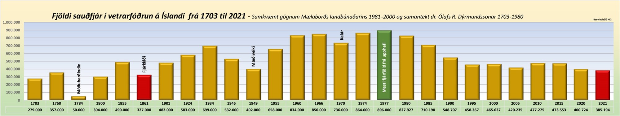 Ef niðurskurður verður mjög mikill í haust, eins og margir tala um, fer fjöldinn að nálgast að vera sá minnsti í 221 ár, en hér voru 304.000 fjár árið 1800.