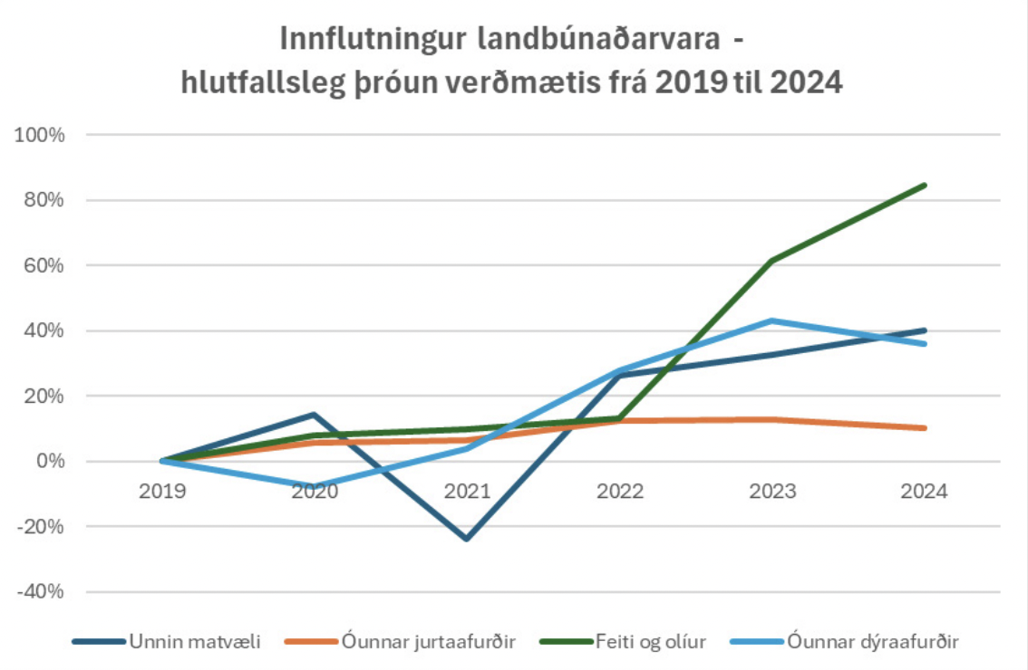 Samkvæmt upplýsingum frá Hagstofu Íslands hefur innflutningur landbúnaðarvara aukist í öllum flokkum á síðastliðnum sex árum sem má rekja til fjölmargra þátta, svo sem íbúafjölgun og fjölgun ferðamanna. En þá hefur einnig orðið aukning á innflutningi sem og verðhækkanir á ýmsum afurðum sem falla undir unnin matvæli, til dæmis fóðurvörur og olíur og feiti sem notaðar eru til framleiðslu á ýmsum landbúnaðarvörum.