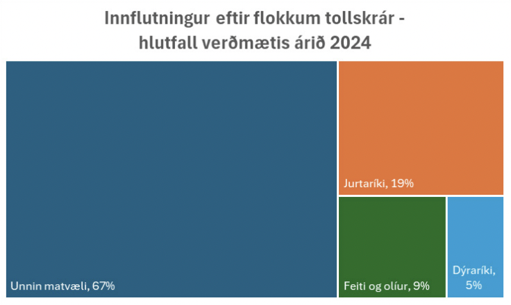 Innflutningur á landbúnaðarvörum samkvæmt tollskrárflokkum nær yfir mjög breitt svið. Þannig eru óunnar dýraafurðir gjarnan flokkaðar sérstaklega svo sem kjöt, mjólkurafurðir og egg. En undir óunnar jurtaafurðir fellur meðal annars grænmeti, ávextir, kaffi, kornvörur og plöntur. Ef við skoðum skiptingu á innflutningi landbúnaðarvara eftir helstu flokka tollskrár fyrir árið 2024, þá var um 5% innflutningsverðmætis sem var skilgreint undir dýraríki og 19% sem féll undir jurtaríki. Verðmæti innflutnings sem skilgreint er undir ýmsar olíur og feiti sem tilheyrir landbúnaðarafurðum var um 19% fyrir árið 2024 en langstærsti hluti þess verðmætis sem flutt var inn árið 2024 flokkast sem unnin matvæli eða 67%. Unnin matvæli ná meðal annars yfir unnar kjöt- og grænmetisvörur en einnig drykkjarvörur, brauðmeti, sælgæti og fóðurvörur.