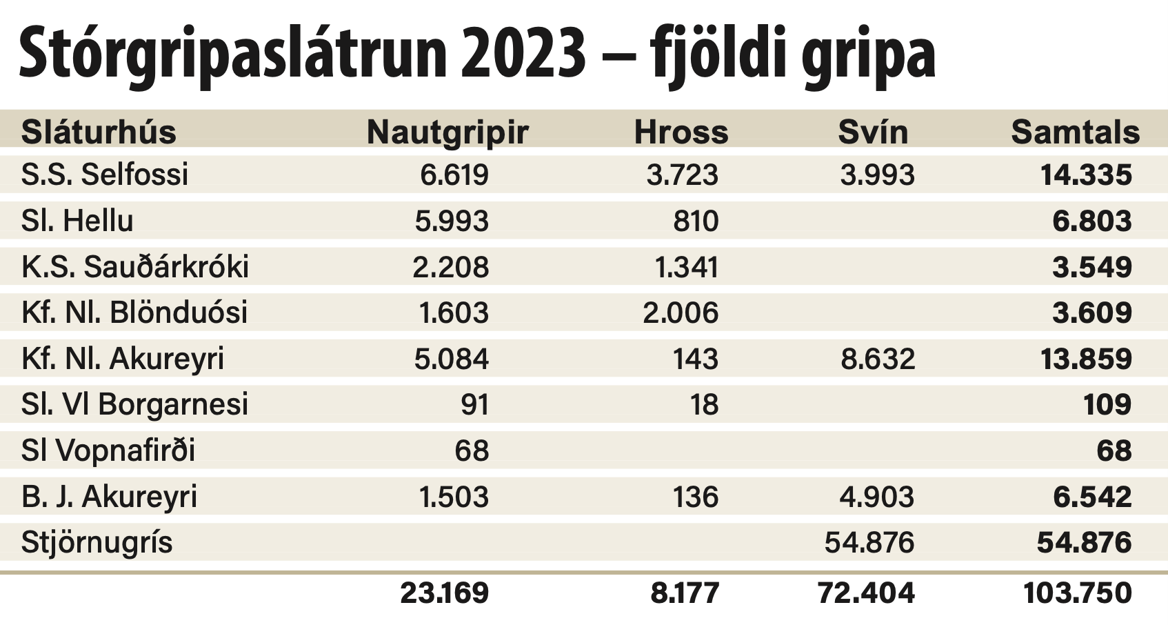 Alls var 103.750 stórgripum slátrað hér á landi árið 2023. Slátrað var á níu stöðum.