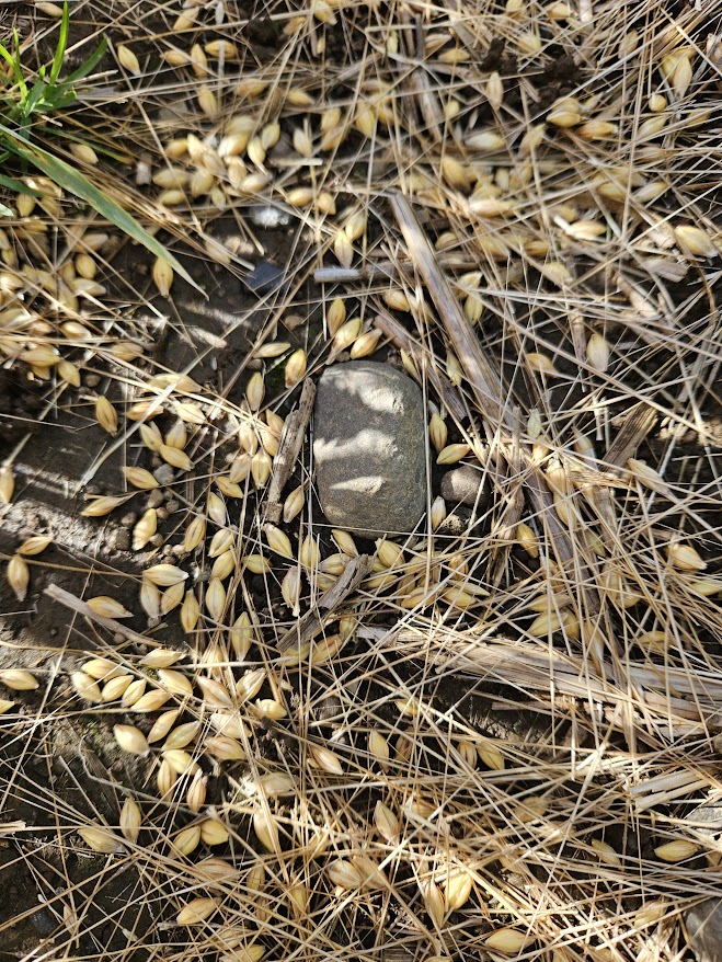 Tómt byggstrá sem bar sex raðir af byggi fyrir storminn.