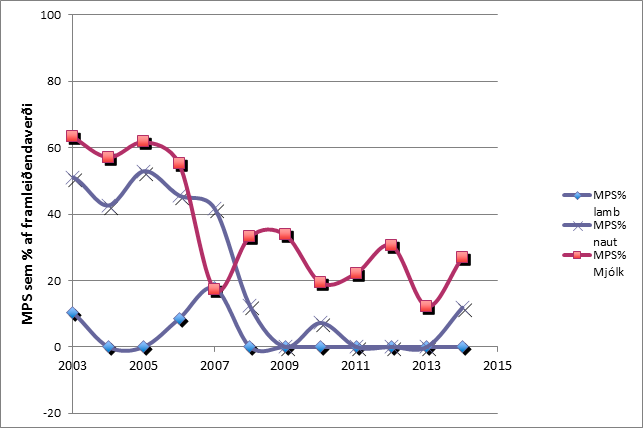 Á mynd 1 sést hvernig markaðsstuðningur fyrir lambakjöt, nautakjöt og mjólk hefur þróast síðustu 10 ár. Í lambakjöti og nautakjöti er markaðsstuðningur ekki til staðar sem þýðir á mannamáli að framleiðendaverð á Íslandi er jafnlágt eða lægra en á heimsmarkaði. Tollar á innflutt kjöt skapa þannig vissa tryggingu fyrir sölu á innanlandsmarkaðinn en innlend samkeppni er svo mikil að verð til bænda er svipað og það myndi vera án tolla.