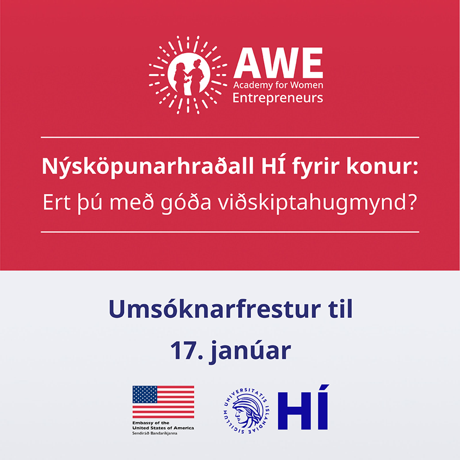 Háskóli Íslands og bandaríska sendiráðið á Íslandi leita að þátttakendum fyrir nýsköpunarhraðalinn Academy for Women Entrepreneurs (AWE), sem er sérstaklega ætlaður konum, og hefst 3. febrúar en lýkur með útskrift þann 6. maí.