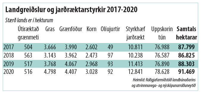 Rétt fyrir áramót birti atvinnuvega- og nýsköpunarráðuneytið niðurstöður varðandi jarðræktarstyrki og landgreiðslur fyrir síðasta ár. Landgreiðslur voru greiddar vegna 78.628 hektara, en voru 76.890 hektarar árið 2019. Jarðræktarstyrkir voru greiddir fyrir 12.325 hektara, en árið 2019 var greitt fyrir 11.413 hektara.
